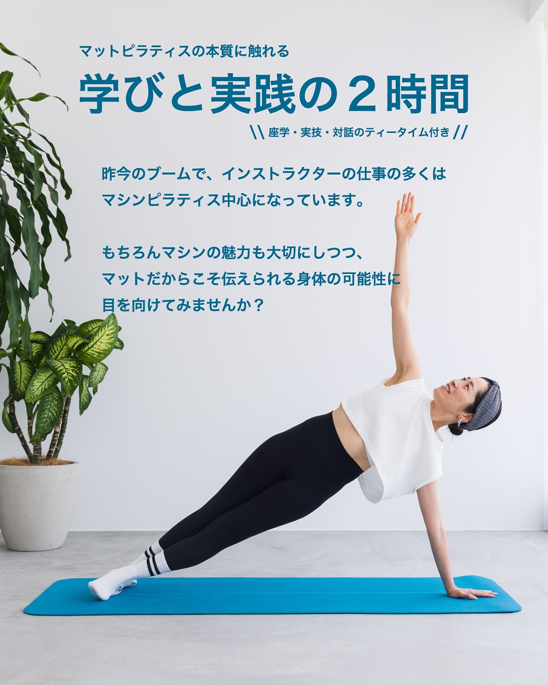 内容:マットピラティスの本質に触れる、学びと実践の2時間(座学・実技・ティータイム)